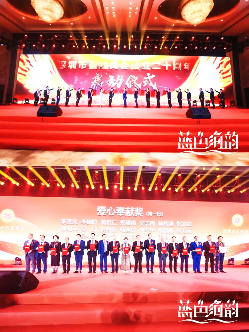 「藍色海韻」廣東深圳商會周年慶典活動策劃公司提供的會議會務類演出公關廣告傳媒案例,2023年12月3日,“楊帆逐夢大灣區·勇立潮頭譜新篇”深圳市福建商會成立二十周年慶典大會在深圳福田香格里拉酒店舉行,在深鄉賢代表、兄弟商會嘉賓代表、商會全體理監事等代表共計900多人出席周年慶活動會議現場共襄盛典。在隆重的雄獅引領下,領導們闊步進入慶典大會現場,祝福熱場視頻,燃動全場,盈溢溫馨祝福!